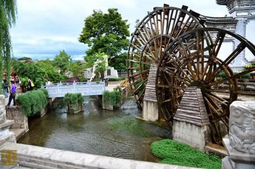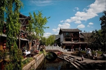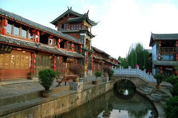 四方街幽深的街巷,青石鋪就的道路兩邊,所有的房屋全是磚木結(jié)構(gòu)。門(mén)窗欄棟、斗拱飛檐大都雕刻著花鳥(niǎo)蟲(chóng)魚(yú)、飛禽走獸的花紋。這城市本身就是座公園,小橋流水、樹(shù)木花朵。耳聞?dòng)竦雁~蕭的悠揚(yáng),或黃鸝棲翠柳的鳴唱;它與中國(guó)古代那種普遍的有城墻的城市不同;除了木王府四周有圍墻外,麗江是中國(guó)唯一不設(shè)防的古城。人們可以從四面八方通過(guò)街道、小路、巷子、田野甚至山上的羊腸小道進(jìn)入這個(gè)城市。四方街麗江是一個(gè)日日夜夜和淙淙流水相約的城市,就像威尼斯那樣。不過(guò)大研鎮(zhèn)的水道,是經(jīng)過(guò)設(shè)計(jì)用人工挖掘的。原始的河流只有一條,就是穿城而過(guò)的中河,從中河又人工開(kāi)發(fā)出西河和東河,分為三支,像一棵大樹(shù)的主干和兩個(gè)支干。從它們又生出無(wú)數(shù)的小渠。居民們甚至可以直接飲用這泉水。四方街是一個(gè)梯形的小廣場(chǎng),建造時(shí)被設(shè)計(jì)得中間稍微凸起,兩邊凹下,猶如一片巨瓦。